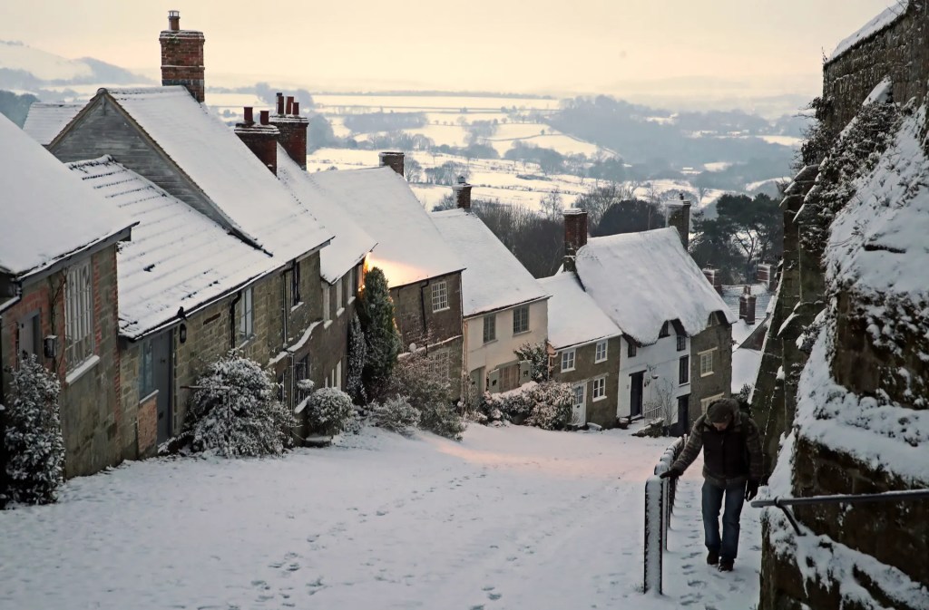 (Image 3) On Dorset’s Hill Bedded down beneath the snow, To Dorset’s hills I gladly go And whither then, I cannot know. Somewhere on these cobbled streets A traveler I hope to meet And whither then, I cannot see. When I arrive upon the crest Of Gold Hill, I will take my rest And whither then, I only guess. Yes, all will climb this Shaftesb’ry road When winter drops its heavy load And then the time will come to go.