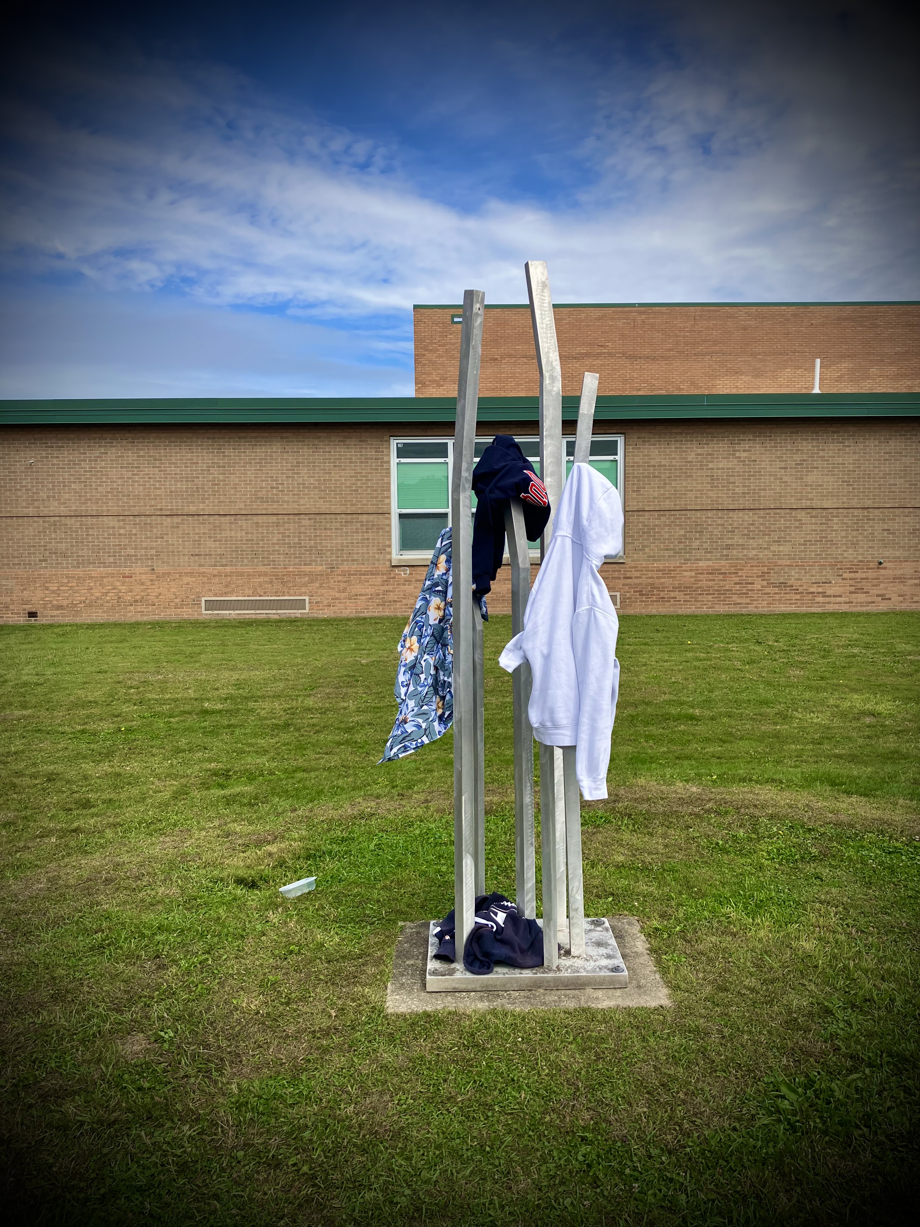 However, watching a group of students either skip or race through lunch in order to play “DeathHack” has captured my attention, especially considering the odd juxtaposition of their game in the close proximity to a piece of modern art which they use as a clothing rack-of-sorts. In fact, it has kept me from finishing a poem I have been working on for the past two weeks about building a retaining wall with rocks from Wolf Creek. What follows is a poem in the style of a sonnet, but with a structural form that better echoes the format of the game: sets of three rather than four, which is more typical in a sonnet form. The term “adumbration” best encapsulates what I hoped to achieve with this sonnet: a partial outline that suggests or foreshadows something bigger about humanity in general. I dedicate this poem to the students of Grove City High School who faithfully “beat the grass brown…beside [the] stalks of steel sprout[ing] from the ground.” (You do know who I allude to in the final line, right?)